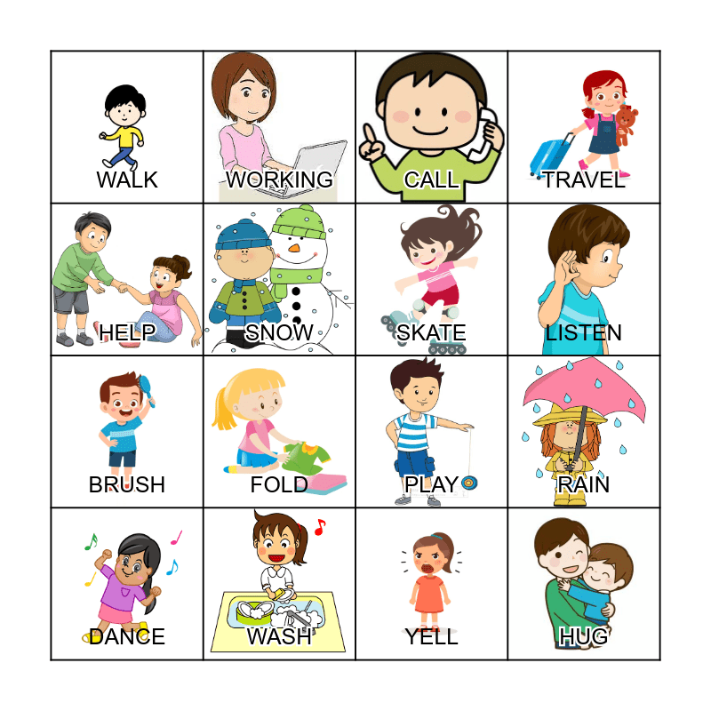 This bingo card has 16 images and 16 words: DANCE, WASH, CALL, TRAVEL, HELP, WORKING, PLAY, RAIN, WALK, SNOW, YELL, LISTEN, BRUSH, FOLD, SKATE and HUG.