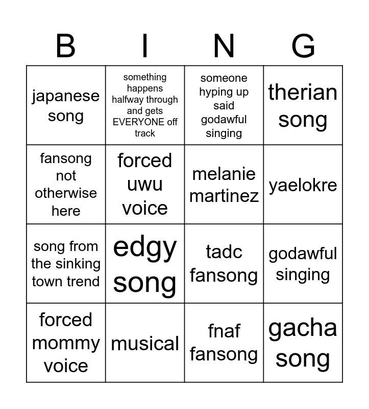This bingo card has 16 words: musical, godawful singing, someone hyping up said godawful singing, japanese song, song from the sinking town trend, something happens halfway through and gets EVERYONE off track, tadc fansong, fnaf fansong, fansong not otherwise here, forced uwu voice, forced mommy voice, therian song, edgy song, yaelokre, melanie martinez and gacha song.