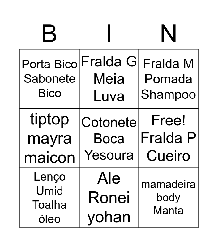 This bingo card has a free space and 8 words: Free! Fralda P Cueiro, Fralda M Pomada Shampoo, Fralda G Meia Luva, Lenço Umid Toalha óleo, Porta Bico Sabonete Bico, mamadeira body Manta, tiptop mayra maicon and Ale Ronei yohan.