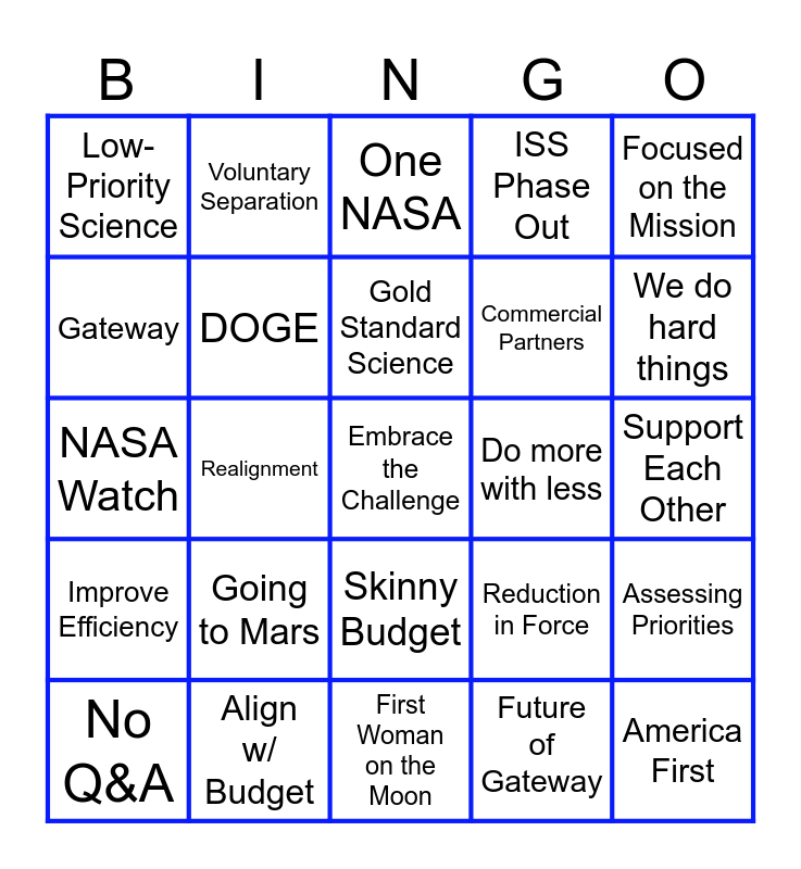 This bingo card has a free space and 42 words: Streamline Operations, Gold Standard Science, Restructuring, Going to Mars, Future of Gateway, Assessing Priorities, America First, Marching Forward, One NASA, Skinny Budget, Support Each Other, We do hard things, Realignment, Focused on the Mission, Sacrifice, Reduction in Force, Workforce Transitions, NASA Watch, Executive Orders, Voluntary Separation, Gateway, Loyalty to the President, President's Vision, Low-Priority Science, Future of Orion, Return to the Moon, Commercial Partners, Consolidation, Jared Isaacman, Radical Retraining, Optimize Organization, Improve Efficiency, DOGE, First Woman on the Moon, Elon Musk, No Q&A, Align w/ Budget, Do more with less, Geographic Realignment, Return of Discovery Shuttle, ISS Phase Out and First Human on Mars.