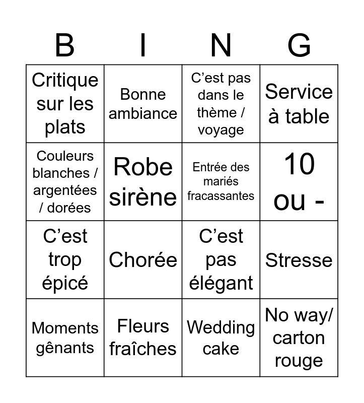 This bingo card has 16 words: Fleurs fraîches, Stresse, C’est pas dans le thème / voyage, Critique sur les plats, C’est trop épicé, Bonne ambiance, C’est pas élégant, Wedding cake, Couleurs blanches / argentées / dorées, Robe sirène, Moments gênants, Service à table, Chorée, 10 ou -, Entrée des mariés fracassantes and No way/ carton rouge.