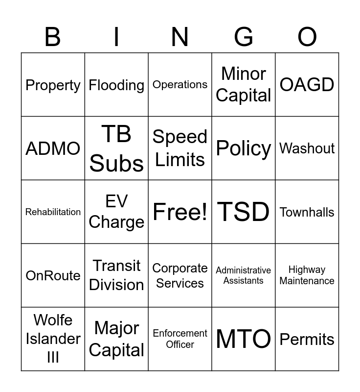 This bingo card has a free space and 44 words: Highway, Permits, Wolfe Islander IV, Wolfe Islander III, Development, MTO, Operations, TIMD, OAGD, Major Capital, Minor Capital, TSD, Corporate Services, Transit Division, Geomatics, Enforcement Officer, Ferries, Rehabilitation, Paving, Washout, Flooding, Fire, Cows on Highway, Property, Fun Friday, Townhalls, Bridges, Infrastructure, Administrative Assistants, OnRoute, Winter Storms, Highway Maintenance, 511, Towing, EV Charge, Service Ontario, Signs!, Construction Zones, Speed Limits, ADMO, Policy, MRTR, TB Subs and Divisional Services.