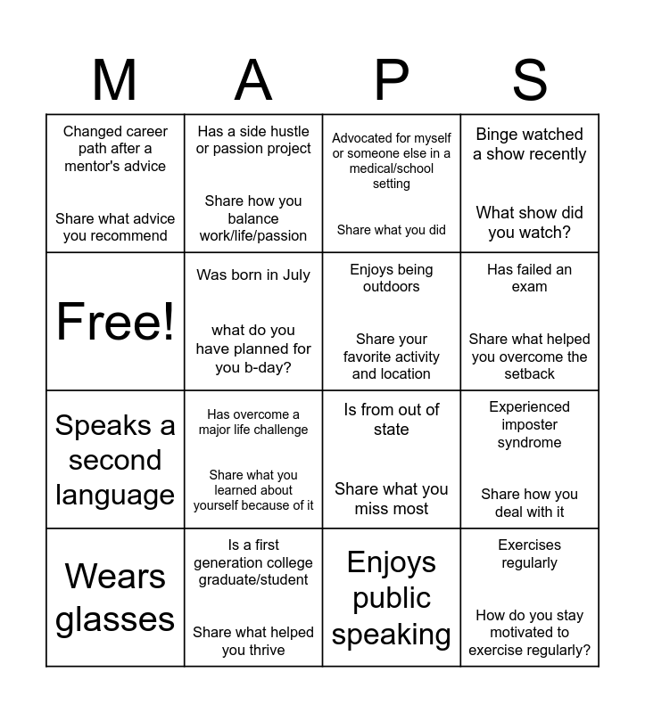 This bingo card has 16 words: Is a first generation college graduate/student Share what helped you thrive, Experienced imposter syndrome Share how you deal with it, Advocated for myself or someone else in a medical/school setting Share what you did, Changed career path after a mentor's advice Share what advice you recommend, Speaks a second language, Has a side hustle or passion project Share how you balance work/life/passion, Is from out of state Share what you miss most, Enjoys public speaking, Free!, Was born in July what do you have planned for you b-day?, Wears glasses, Binge watched a show recently What show did you watch?, Has overcome a major life challenge Share what you learned about yourself because of it, Has failed an exam Share what helped you overcome the setback, Enjoys being outdoors Share your favorite activity and location and Exercises regularly How do you stay motivated to exercise regularly?.