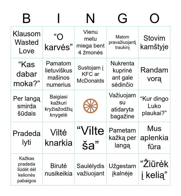 This bingo card has a free space and 24 words: Kažkas pradeda liūdėt dėl kelionės pabaigos, Viltė knarkia, Sustojam į KFC ar McDonalds, Užgestam įkalnėje, Stovim kamštyje, Klausom Wasted Love, “O karvės”, Vienu metu miega bent 4 žmonės, Važiuojam su atidaryta bagažine, “Kur dingo Luko plaukai?”, Per langą smirda šūdais, Pamatom lietuviškus mašinos numerius, Pametam kažką per langą, Mus aplenkia fūra, “Kas dabar moka?”, Birutė nusikeikia, Saulėlydis važiuojant, Matom pravažiuojantį traukinį, Randam vorą, Pradeda lyti, Baigiasi kažkuri kryžiažodžių knygelė, “Vilte ša”, Nukrenta kuprinė ant gale sėdinčio and “Žiūrėk į kelią”.