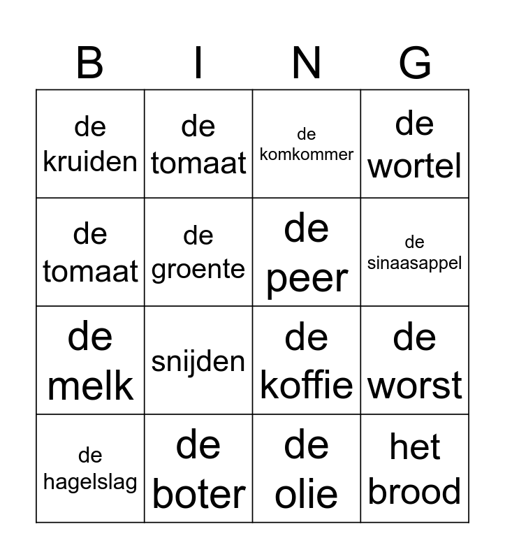 This bingo card has 28 words: De suiker, de thee, de melk, het fruit, de groente, de komkommer, de tomaat, het brood, de boter, de kaas, de koffie, de wortel, roeren, koken, snijden, de prei, de appel, de peer, de sinaasappel, het zout, de kruiden, de peper, de hagelslag, de worst, de olie, de sla, de tomaat and de duiven.