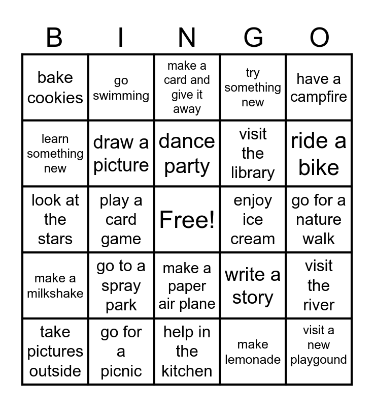 This bingo card has a free space and 24 words: go to a spray park, go for a picnic, dance party, take pictures outside, have a campfire, bake cookies, learn something new, go swimming, enjoy ice cream, make a paper air plane, visit the library, look at the stars, write a story, visit the river, draw a picture, make lemonade, go for a nature walk, make a card and give it away, ride a bike, play a card game, visit a new playgound, make a milkshake, try something new and help in the kitchen.