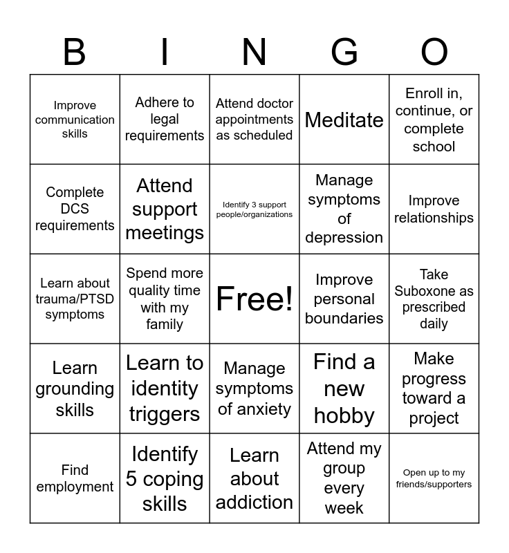 This bingo card has a free space and 24 words: Learn to identity triggers, Identify 5 coping skills, Identify 3 support people/organizations, Find employment, Enroll in, continue, or complete school, Improve communication skills, Complete DCS requirements, Adhere to legal requirements, Improve personal boundaries, Manage symptoms of anxiety, Manage symptoms of depression, Learn about trauma/PTSD symptoms, Find a new hobby, Make progress toward a project, Attend support meetings, Attend my group every week, Take Suboxone as prescribed daily, Attend doctor appointments as scheduled, Improve relationships, Spend more quality time with my family, Open up to my friends/supporters, Learn grounding skills, Meditate and Learn about addiction.