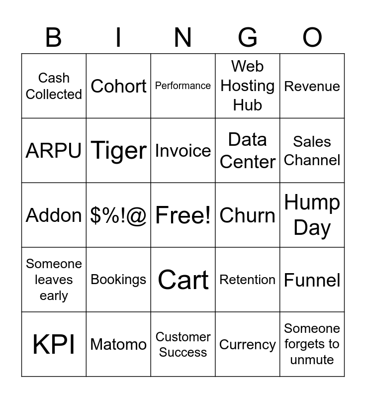 This bingo card has a free space and 24 words: Bookings, Matomo, Invoice, KPI, Revenue, Cash Collected, ARPU, Cohort, Churn, Cart, Data Center, Addon, Retention, Funnel, Tiger, Currency, Hump Day, Performance, Sales Channel, $%!@, Someone forgets to unmute, Someone leaves early, Web Hosting Hub and Customer Success.