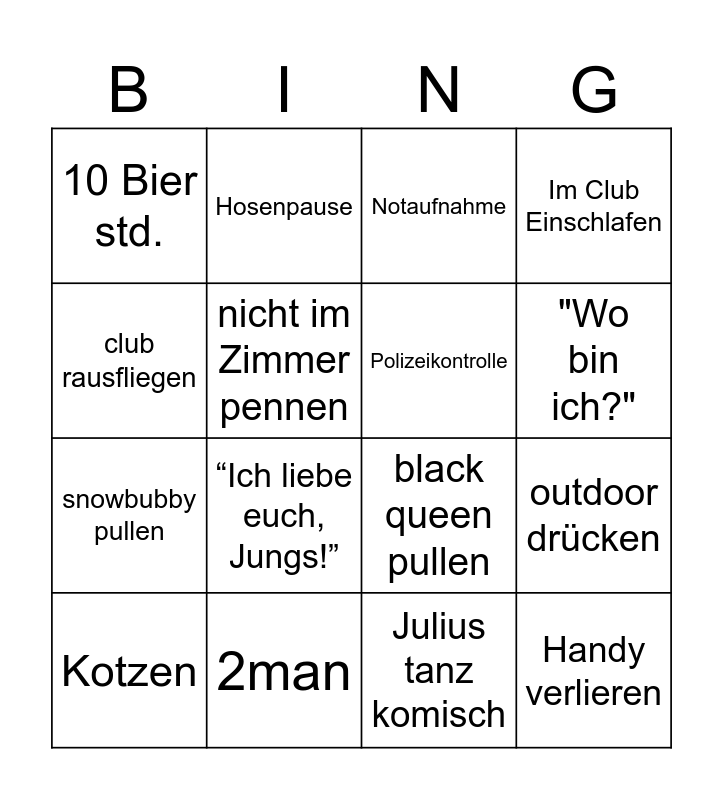 This bingo card has 16 words: 2man, outdoor drücken, Notaufnahme, 10 Bier std., snowbubby pullen, Hosenpause, black queen pullen, Julius tanz komisch, club rausfliegen, nicht im Zimmer pennen, Kotzen, Im Club Einschlafen, “Ich liebe euch, Jungs!”, "Wo bin ich?", Polizeikontrolle and Handy verlieren.