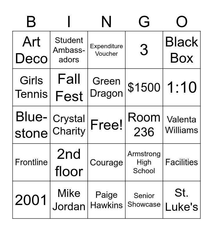 This bingo card has a free space and 24 words: 2nd floor, Mike Jordan, Green Dragon, 2001, Black Box, Art Deco, Girls Tennis, Student Ambass-adors, Room 236, Courage, $1500, Blue-stone, Armstrong High School, Facilities, Fall Fest, Senior Showcase, Valenta Williams, Expenditure Voucher, 1:10, Crystal Charity, St. Luke's, Frontline, 3 and Paige Hawkins.