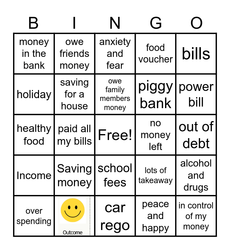 This bingo card has 1 images, a free space and 23 words: Saving money, owe family members money, over spending, bills, money in the bank, holiday, owe friends money, no money left, school fees, piggy bank, healthy food, lots of takeaway, alcohol and drugs, saving for a house, peace and happy, out of debt, anxiety and fear, power bill, paid all my bills, in control of my money, Income, food voucher and car rego.