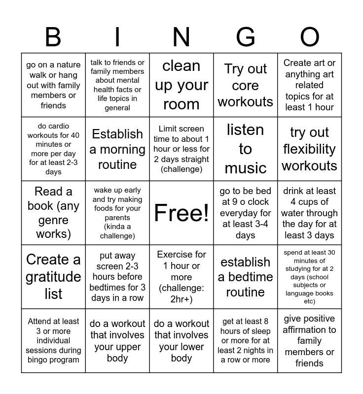 This bingo card has a free space and 24 words: Attend at least 3 or more individual sessions during bingo program, put away screen 2-3 hours before bedtimes for 3 days in a row, Limit screen time to about 1 hour or less for 2 days straight (challenge), get at least 8 hours of sleep or more for at least 2 nights in a row or more, Create art or anything art related topics for at least 1 hour, go on a nature walk or hang out with family members or friends, talk to friends or family members about mental health facts or life topics in general, clean up your room, go to be bed at 9 o clock everyday for at least 3-4 days, drink at least 4 cups of water through the day for at least 3 days, Read a book (any genre works), Establish a morning routine, establish a bedtime routine, spend at least 30 minutes of studying for at 2 days (school subjects or language books etc), do cardio workouts for 40 minutes or more per day for at least 2-3 days, do a workout that involves your upper body, do a workout that involves your lower body, Try out core workouts, try out flexibility workouts, Create a gratitude list, wake up early and try making foods for your parents (kinda a challenge), Exercise for 1 hour or more (challenge: 2hr+), listen to music and give positive affirmation to family members or friends.