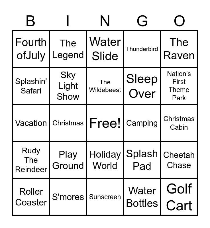 This bingo card has a free space and 29 words: Roller Coaster, Thanksgiving, Christmas, Halloween, Fourth ofJuly, Water Slide, Sky Light Show, Play Ground, Camping, S'mores, Christmas Cabin, Golf Cart, Sunscreen, Water Bottles, Nation's First Theme Park, Santa Claus, Indiana, Holiday World, Rudy The Reindeer, The Raven, Vacation, Splash Pad, Lake Rudolf, Sleep Over, Splashin' Safari, Thunderbird, The Legend, Cheetah Chase, The Wildebeest and Mammoth Water Coaster.