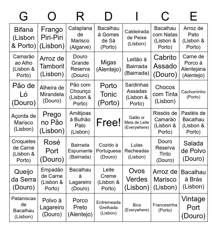 This bingo card has a free space and 59 words: Açorda à Alentejana (Alentejo), Açorda de Marisco (Lisbon), Água das Pedras / Água Castello (Everywhere), Alheira de Mirandela (Douro), Amêijoas à Bulhão Pato (Lisbon), Arroz de Marisco (Lisbon), Arroz de Pato (Lisbon & Porto), Arroz de Polvo (Lisbon & Porto), Arroz de Tamboril (Lisbon), Bacalhau à Brás (Lisbon), Bacalhau à Gomes de Sá (Porto), Bacalhau à Lagareiro (Douro), Bacalhau com Natas (Lisbon & Porto), Bairrada Espumante (Bairrada), Bica (Everywhere), Bifana (Lisbon & Porto), Cabrito Assado (Douro), Caldeirada de Peixe (Lisbon), Caldo Verde (Douro), Camarão ao Alho (Lisbon & Porto), Carne de Porco à Alentejana (Alentejo), Cataplana de Marisco (Algarve), Cachorrinho (Porto), Chocos com Tinta (Lisbon), Conserveiras (Lisbon & Porto), Cozido à Portuguesa (Douro), Croquetes de Carne (Lisbon & Porto), Douro Branco (Douro), Douro Grande Reserva (Douro), Douro Reserva Tinto (Douro), Douro Tinto (Douro), Empadão de Carne (Lisbon & Porto), Entremeada Grelhada (Lisbon), Francesinha (Porto), Frango Piri-Piri (Lisbon), Galão or Meia de Leite (Everywhere), Leite Creme (Lisbon & Porto), Leitão à Bairrada (Bairrada), Lulas Recheadas (Lisbon), Migas (Alentejo), Ovos Verdes (Lisbon), Pão com Chouriço (Lisbon & Porto), Pão de Ló (Douro), Pastel de Nata (Lisbon), Pastéis de Bacalhau (Lisbon & Porto), Pataniscas de Bacalhau (Lisbon), Polvo à Lagareiro (Douro), Porco Preto (Alentejo), Porto Tonic (Porto), Prego no Pão (Lisbon), Queijadas de Sintra (Lisbon), Queijo da Serra (Douro), Rissóis de Camarão (Lisbon & Porto), Rosé Port (Douro), Salada de Polvo (Douro), Sardinhas Assadas (Lisbon & Porto), Vinho Verde (Minho), Vintage Port (Douro) and White Port (Douro).