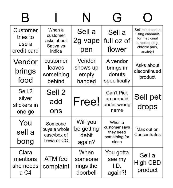 This bingo card has a free space and 60 words: Leonard is buying stuff off his shift, ATM fee complaint, Max out the allotment on Betty’s, You sell a bong, You gotta see my I.D. again?!, “How much are the stickers?”, customer leaves something behind, What do you mean it's sold out?, A vendor brings in donuts specifically, Went to the wrong side of the store, Sell a full oz of flower, When a customer does a "happy dance" in the store, Vendor brings food, Bathroom light doesn’t turn on, Sell to someone celebrating their birthday, Customer tries to use a credit card, Sell a High CBD product, Sell to someone using cannabis for medicinal purposes (e.g., chronic pain, anxiety), Customer wants specific employee, Vendor shows up empty handed, Can’t Pick up prepaid under wrong name, Sell a 2g vape pen, Ciara mentions she needs a C4, Max out on Concentrates, Cart/Vape return, Customer complains about nanobots and black magic, Doesn’t scan, Means it’s free right?, Someone asks what TAC is, Asks about discontinued product, When a customer asks about CBD only products, If you get a manny fist bump, Brand rep comes in, Someone asks for any pre roll or flower with the highest TAC, Oh you guys sell ice cream?!, When a customer asks about Sativa vs Indica, Bathroom in middle of transaction, Sell a six pack, Sell 2 add ons, When a customer mentions they're a first-time user, Sell 2 silver stickers in one go, Sell 3.5g Concentrate, Someone buys a whole case/box of Levia or CQ, Sell pet drops, “MMM IT SMELLS GOOD IN HERE”, When a customer says they need something for sleep, Wants Highest TAC, When a customer asks about deals/discounts, When a customer lets you pick out their whole order, When a customer asks about the "best way to get high", Will you be getting debit again?, When someone rings the doorbell, Visit from Imma or Maddie, When a customer mentions they've been coming to your store for years, Dog!, Preorder customer at Flower wall, Vendor brings swag but not food, customer hands you a list, Menu went ALIEN, Customer says “i just made those this morning” and When a customer has a funny joke or pun related to cannabis.