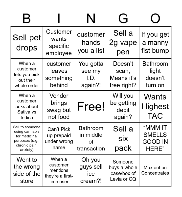 This bingo card has a free space and 60 words: Sell to someone celebrating their birthday, When a customer mentions they're a first-time user, When a customer has a funny joke or pun related to cannabis, Sell to someone using cannabis for medicinal purposes (e.g., chronic pain, anxiety), Someone buys a whole case/box of Levia or CQ, Sell a High CBD product, customer leaves something behind, Dog!, Doesn’t scan, Means it’s free right?, Menu went ALIEN, Sell a 2g vape pen, Asks about discontinued product, When a customer lets you pick out their whole order, ATM fee complaint, Leonard is buying stuff off his shift, Sell pet drops, Max out on Concentrates, If you get a manny fist bump, “How much are the stickers?”, You gotta see my I.D. again?!, Will you be getting debit again?, customer hands you a list, Went to the wrong side of the store, “MMM IT SMELLS GOOD IN HERE”, Sell 2 add ons, Brand rep comes in, Someone asks for any pre roll or flower with the highest TAC, Visit from Imma or Maddie, Bathroom light doesn’t turn on, What do you mean it's sold out?, Vendor shows up empty handed, Max out the allotment on Betty’s, Sell 2 silver stickers in one go, When a customer mentions they've been coming to your store for years, Customer wants specific employee, When a customer asks about the "best way to get high", Someone asks what TAC is, Vendor brings swag but not food, When a customer says they need something for sleep, When a customer asks about Sativa vs Indica, A vendor brings in donuts specifically, Can’t Pick up prepaid under wrong name, Wants Highest TAC, Preorder customer at Flower wall, Sell a six pack, Sell a full oz of flower, Vendor brings food, When a customer asks about CBD only products, Ciara mentions she needs a C4, Bathroom in middle of transaction, Oh you guys sell ice cream?!, Sell 3.5g Concentrate, When a customer does a "happy dance" in the store, Customer complains about nanobots and black magic, Customer tries to use a credit card, Customer says “i just made those this morning”, Cart/Vape return, When someone rings the doorbell, When a customer asks about deals/discounts and You sell a bong.