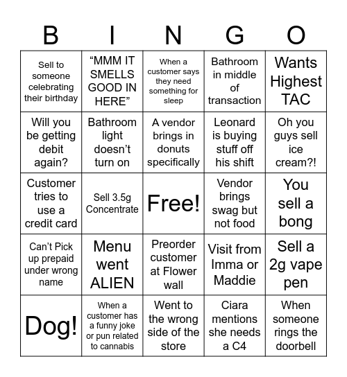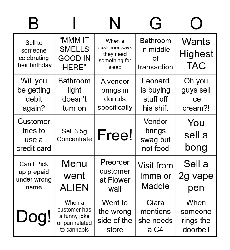 This bingo card has a free space and 60 words: You gotta see my I.D. again?!, When a customer has a funny joke or pun related to cannabis, Brand rep comes in, Can’t Pick up prepaid under wrong name, Ciara mentions she needs a C4, Customer wants specific employee, Bathroom light doesn’t turn on, When a customer does a "happy dance" in the store, Leonard is buying stuff off his shift, Customer says “i just made those this morning”, Bathroom in middle of transaction, “How much are the stickers?”, Will you be getting debit again?, Vendor brings food, What do you mean it's sold out?, Sell to someone celebrating their birthday, When someone rings the doorbell, Wants Highest TAC, When a customer asks about Sativa vs Indica, A vendor brings in donuts specifically, Vendor brings swag but not food, When a customer says they need something for sleep, Dog!, Sell a 2g vape pen, When a customer mentions they've been coming to your store for years, Doesn’t scan, Means it’s free right?, When a customer mentions they're a first-time user, Cart/Vape return, Oh you guys sell ice cream?!, When a customer asks about the "best way to get high", Vendor shows up empty handed, Someone asks what TAC is, When a customer asks about CBD only products, If you get a manny fist bump, “MMM IT SMELLS GOOD IN HERE”, When a customer asks about deals/discounts, customer hands you a list, Sell 3.5g Concentrate, Sell 2 silver stickers in one go, Customer tries to use a credit card, Someone asks for any pre roll or flower with the highest TAC, Menu went ALIEN, You sell a bong, Sell a six pack, Visit from Imma or Maddie, Asks about discontinued product, ATM fee complaint, Sell 2 add ons, customer leaves something behind, Preorder customer at Flower wall, Went to the wrong side of the store, When a customer lets you pick out their whole order, Customer complains about nanobots and black magic, Sell to someone using cannabis for medicinal purposes (e.g., chronic pain, anxiety), Sell pet drops, Someone buys a whole case/box of Levia or CQ, Max out the allotment on Betty’s, Sell a High CBD product, Max out on Concentrates and Sell a full oz of flower.