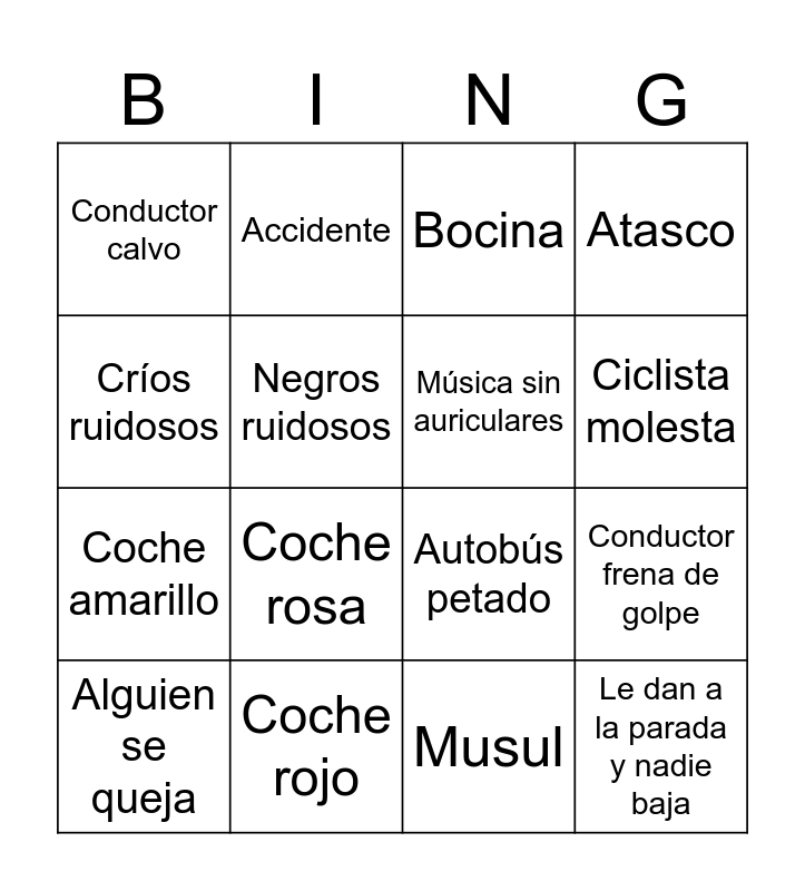 This bingo card has 16 words: Coche rojo, Conductor frena de golpe, Bocina, Conductor calvo, Coche amarillo, Accidente, Autobús petado, Musul, Críos ruidosos, Negros ruidosos, Alguien se queja, Atasco, Coche rosa, Ciclista molesta, Música sin auriculares and Le dan a la parada y nadie baja.