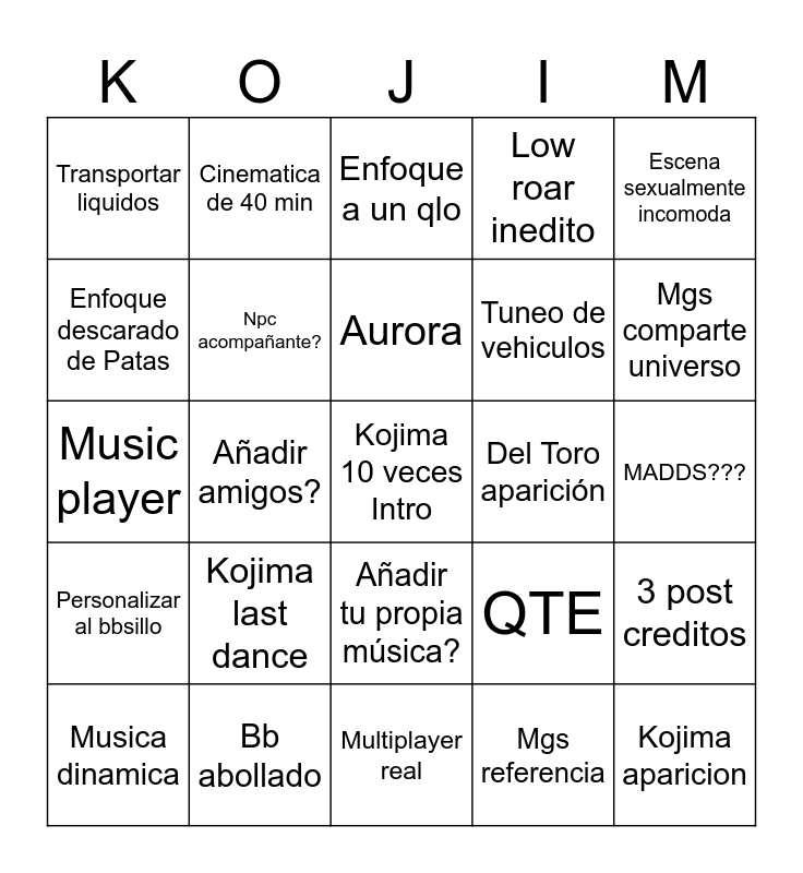 This bingo card has a free space and 24 words: Kojima last dance, Bb abollado, Aurora, Musica dinamica, Escena sexualmente incomoda, Transportar liquidos, Enfoque descarado de Patas, Cinematica de 40 min, Del Toro aparición, Añadir tu propia música?, Tuneo de vehiculos, Music player, QTE, 3 post creditos, Npc acompañante?, Mgs referencia, MADDS???, Enfoque a un qlo, Mgs comparte universo, Añadir amigos?, Kojima aparicion, Personalizar al bbsillo, Low roar inedito and Multiplayer real.
