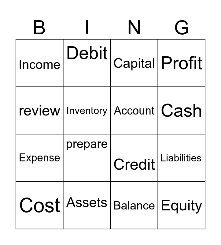 This bingo card has 16 words: Assets, Liabilities, Capital, Income, Expense, Debit, Credit, Balance, review, Inventory, Cost, Profit, prepare, Cash, Account and Equity.