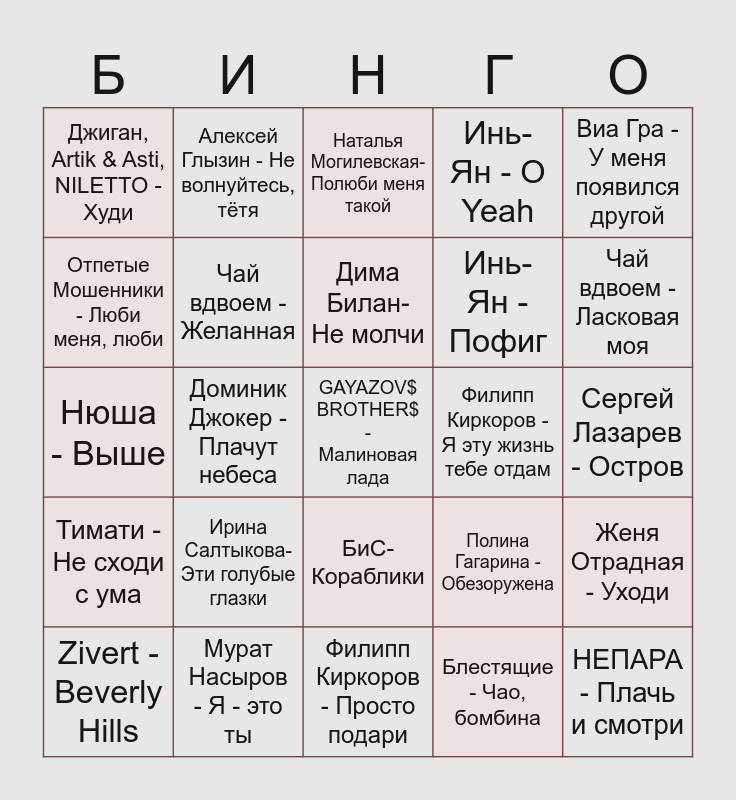 This bingo card has 35 words: Дима Билан- Мечтатели, НЕПАРА - Другая причина, НЕПАРА - Бог тебя выдумал, Чай вдвоем - Желанная, БиС- Кораблики, Инь-Ян - O Yeah, Отпетые Мошенники - Люби меня, люби, Сергей Лазарев - Идеальный мир, Дима Билан- Не молчи, Вирус - Ты меня не ищи, Нюша - Выше, Виа Гра - У меня появился другой, Антон Токарев - Седьмой Лепесток, МакSим-Знаешь ли ты, Джиган, Artik & Asti, NILETTO - Худи, Филипп Киркоров - Я эту жизнь тебе отдам, Блестящие - Чао, бомбина, Доминик Джокер - Плачут небеса, Тимати - Не сходи с ума, GAYAZOV$ BROTHER$ - Малиновая лада, Полина Гагарина - Обезоружена, Zivert - Beverly Hills, Женя Отрадная - Уходи, Мурат Насыров - Я - это ты, Наталья Могилевская- Полюби меня такой, Чай вдвоем - Ласковая моя, НЕПАРА - Плачь и смотри, БиС- Твой или ничей, Инь-Ян - Пофиг, Сергей Лазарев - Остров, Artik & Asti - Девочка, танцуй, Филипп Киркоров - Просто подари, Ирина Салтыкова- Эти голубые глазки, Алексей Глызин - Не волнуйтесь, тётя and Дюна - Воздушный змей.
