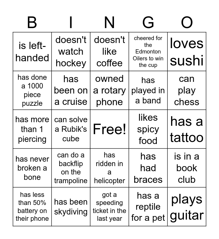 This bingo card has a free space and 31 words: got a speeding ticket in the last year, has worked in a restaurant, can solve a Rubik's cube, owns a horse, is left-handed, doesn't like coffee, has been on a cruise, has had braces, likes spicy food, has a reptile for a pet, has a tattoo, plays guitar, drives a motorcycle, makes their own wine, can play chess, has been suspended from school, is in a book club, can do a backflip on the trampoline, has never broken a bone, has ridden in a helicopter, loves sushi, has no unread emails on their phone, has less than 50% battery on their phone, doesn't watch hockey, has played in a band, has done a 1000 piece puzzle, cheered for the Edmonton Oilers to win the cup, has more than 1 piercing, has been skydiving, owned a rotary phone and does gymnastics.