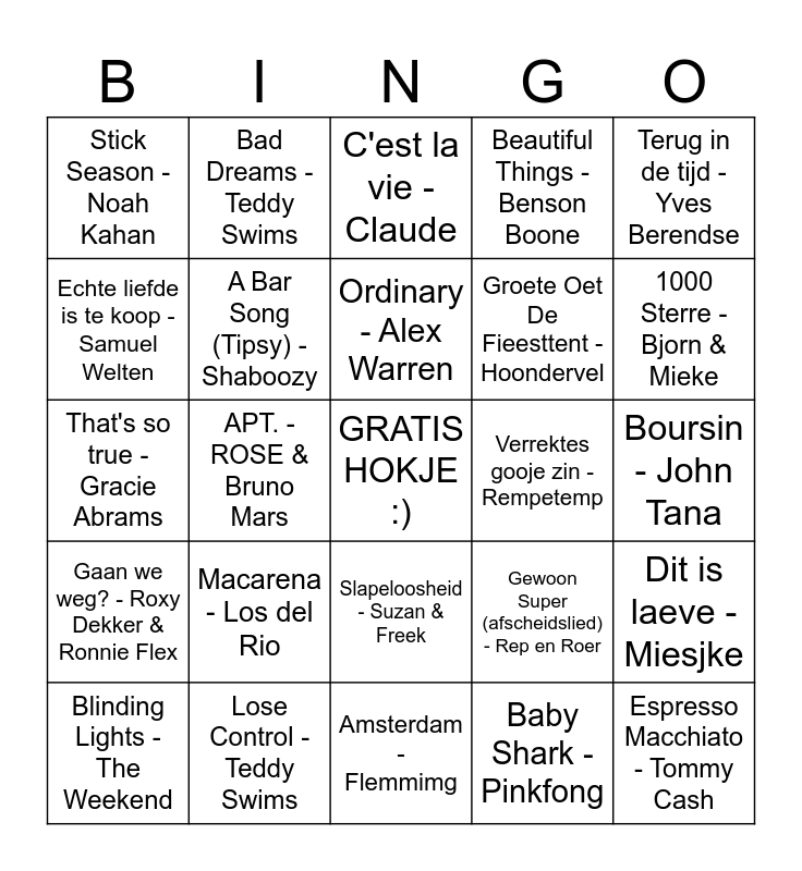 This bingo card has a free space and 75 words: Baila de Gasolina - Effe Serieus, Goud - Suzan & Freek, C'est la vie - Claude, Automatisch - Flemming, Banaan - Jeroen Schipper, Het bananenlied - De Boswachters, Hallo - Antoon, Sugardaddy - Roxy Dekker, Lotje - Lustrum U.V.S.V, Ik zing - Zoe Livay & Snelle, In de schuur - Snelle & Ronnie Flex, Gewoon super - Rep en Roer, Ordinary - Alex Warren, Echte liefde is te koop - Samuel Welten, Die with a smile - Lady Gaga & Bruno Mars, APT. - ROSE & Bruno Mars, Messy - Lola Young, Espresso Macchiato - Tommy Cash, Azizam - Ed Sheeran, Terug in de tijd - Yves Berendse, Espresso - Sabrina Carpenter, That's so true - Gracie Abrams, A Bar Song (Tipsy) - Shaboozy, Bad Dreams - Teddy Swims, Beautiful Things - Benson Boone, Manchild - Sabrina Carpenter, Manusje-Van-Alles - Rep en Roer, Vakkenvuller - Rep en Roer, De Beste Supermarkt - Rep en Roer, Wij zijn van de televisie - Rep en Roer, Alle kleuren van de regenboog - Rep en Roer, Make-Overlied - Rep en Roer, Doe De Courgette - Rep en Roer, Gewoon Super (afscheidslied) - Rep en Roer, 1000 Sterre - Bjorn & Mieke, Groete Oet De Fieesttent - Hoondervel, Ik Wooj Nie Gaon - Van Lieshout en Arts, Dit Is Vastelaovend - BINK, Boursin - John Tana, Baby Shark - Pinkfong, Flowers- Miley Cyrus, Houdini - Dua Lipa, Training Season - Dua Lipa, Cruel Summer - Taylor Swift, Austin - Dasha, I had some help - Post Malone, Blinding Lights - The Weekend, Stick Season - Noah Kahan, Bad Habits - Ed Sheeran, Belong Together - Mark Ambor, Batterij - Suzan & Freek, Slapeloosheid - Suzan & Freek, Huisfeestje - Bankzitters & Roxy Dekker, Anne-Fleur Vakantie - Roxy Dekker, Je blik richting mij - Bankzitters, Entourage - Bankzitters, Eland Op Een Eiland - Jeroen Schipper, All I want for Christmas is you - Mariah Carey, We don't talk about Bruno - Carolina Gaitan, Oze Sjtad - Wiesse Oet Zuus, Macarena - Los del Rio, Dushi Bida- Jeon, Snowman - Sia, Last Christmas - WHAM!, Ojjem blieve hale - Pruuf Mar, Verrektes gooje zin - Rempetemp, Vastenach! - Spik en Span, Vasteloavend is... - Danny Pauwels, Wackelkontakt - Omara, Dit is laeve - Miesjke, Gaan we weg? - Roxy Dekker & Ronnie Flex, Lose Control - Teddy Swims, Satisfyer - Roxy Dekker, Amsterdam - Flemmimg and Zij wil mij - Flemmimg.