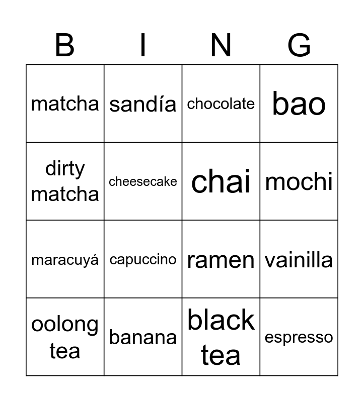 This bingo card has 31 words: taro, oreo, vainilla, flan, matcha, chocolate, chai, coco, banana, strawberry, black tea, oolong tea, thai tea, jasmine tea, capuccino, caramel machiatto, moka, dirty taro, espresso, afogatto, dirty matcha, limón, mango con chile, sandía, maracuyá, cheesecake, bao, ramen, tapioca, mochi and rex.
