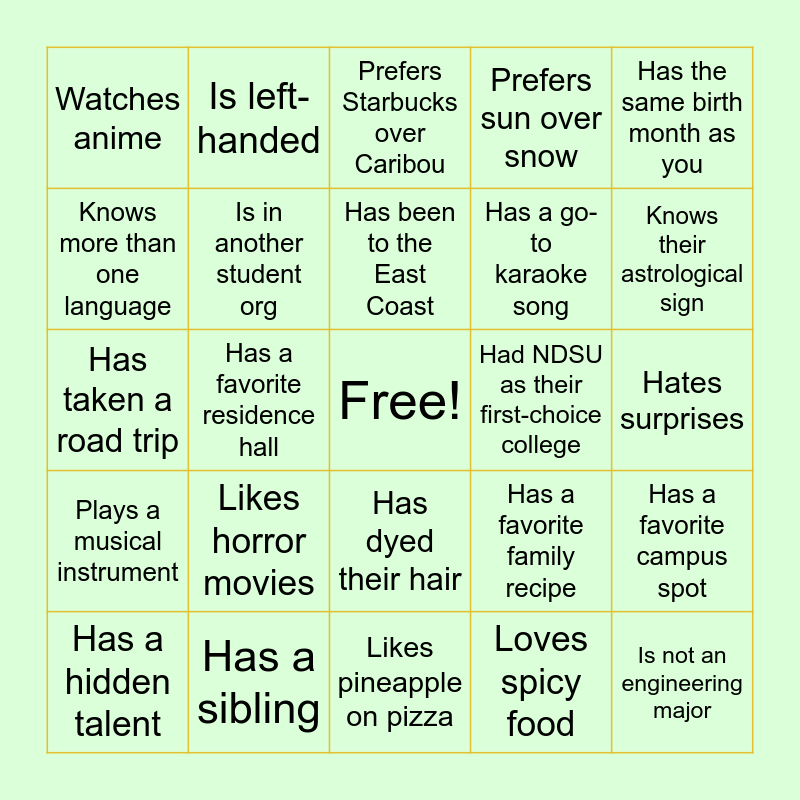 This bingo card has a free space and 24 words: Likes horror movies, Has a sibling, Has been to the East Coast, Has a hidden talent, Has the same birth month as you, Watches anime, Knows more than one language, Is left-handed, Had NDSU as their first-choice college, Has dyed their hair, Has a go-to karaoke song, Has taken a road trip, Has a favorite family recipe, Has a favorite campus spot, Is in another student org, Loves spicy food, Hates surprises, Prefers Starbucks over Caribou, Knows their astrological sign, Has a favorite residence hall, Is not an engineering major, Plays a musical instrument, Prefers sun over snow and Likes pineapple on pizza.