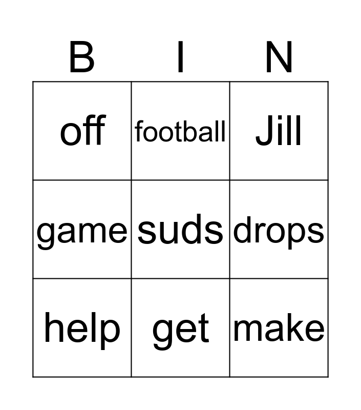 This bingo card has a free space and 8 words: drops, Jill, football, help, off, make, game and get.