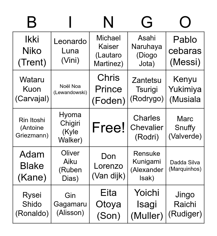 This bingo card has a free space and 32 words: Yoichi Isagi (Muller), Meguru Bachira (Dinho), Hyoma Chigiri (Kyle Walker), Julian Loki (Mbappe), Adam Blake (Kane), Noël Noa (Lewandowski), Pablo cebaras (Messi), Dadda Silva (Marquinhos), Leonardo Luna (Vini), Sae Itoshi (Bellingham), Chris Prince (Foden), Michael Kaiser (Lautaro Martinez), Seishiro Nagi (Kvara), Reo Mikage (De bruyne), Charles Chevalier (Rodri), Tabito Karasu (Casemiro), Rysei Shido (Ronaldo), Rin Itoshi (Antoine Griezmann), Don Lorenzo (Van dijk), Oliver Aiku (Ruben Dias), Rensuke Kunigami (Alexander Isak), Shoei Baro (Haaland), Marc Snuffy (Valverde), Gin Gagamaru (Alisson), Jingo Raichi (Rudiger), Asahi Naruhaya (Diogo Jota), Zantetsu Tsurigi (Rodrygo), Wataru Kuon (Carvajal), Ikki Niko (Trent), Eita Otoya (Son), Yo Hiori (Kimmich) and Kenyu Yukimiya (Musiala.