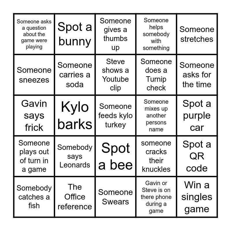 This bingo card has 25 words: Somebody says Leonards, Someone Swears, Steve shows a Youtube clip, Somebody catches a fish, Someone stretches, Someone asks a question about the game were playing, Someone sneezes, Spot a bunny, Someone mixes up another persons name, Spot a bee, Someone does a Turnip check, Gavin says frick, someone cracks their knuckles, Spot a QR code, Someone carries a soda, Win a singles game, Spot a purple car, Someone gives a thumbs up, Someone asks for the time, Kylo barks, Someone feeds kylo turkey, The Office reference, Someone plays out of turn in a game, Someone helps somebody with something and Gavin or Steve is on there phone during a game.