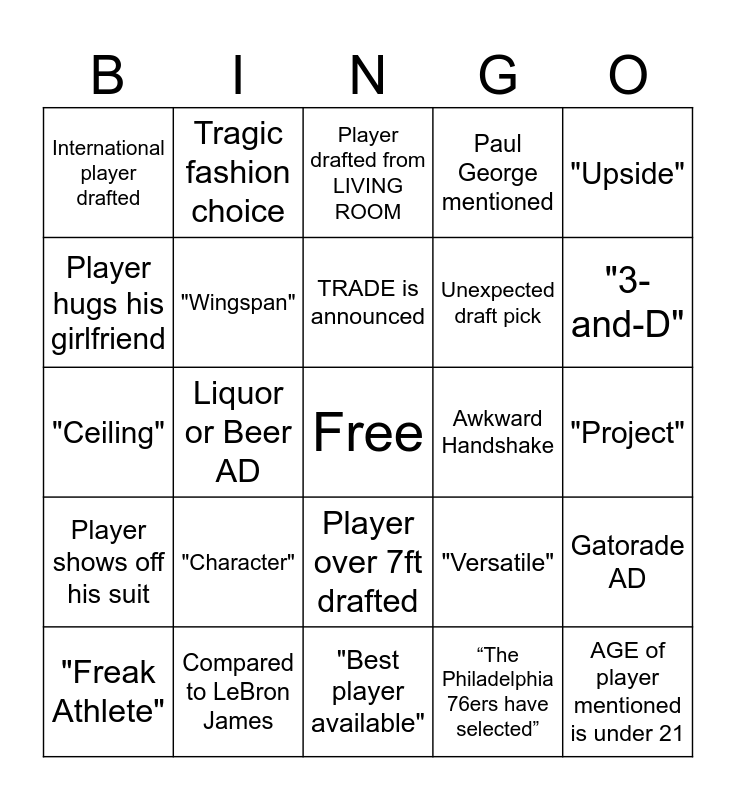 This bingo card has a free space and 34 words: Player from Duke taken, “The Philadelphia 76ers have selected”, Player cries, Player thanks his mom, Player shows off his suit, "Wingspan", "Upside", "Freak Athlete", Tragic fashion choice, Player comparison, TRADE is announced, Player drafted from LIVING ROOM, Player from Rutgers taken, Pick is BOOed, Awkward Handshake, "3-and-D", Compared to LeBron James, "Ceiling", "Character", "Versatile", Player over 7ft drafted, Player is SHORTER than Adam Silver, International player drafted, "Project", "Best player available", AGE of player mentioned is under 21, Paul George mentioned, "Explosive", Unexpected draft pick, Player hugs his girlfriend, “Defensive Player”, Liquor or Beer AD, Gatorade AD and Player from Duke taken.