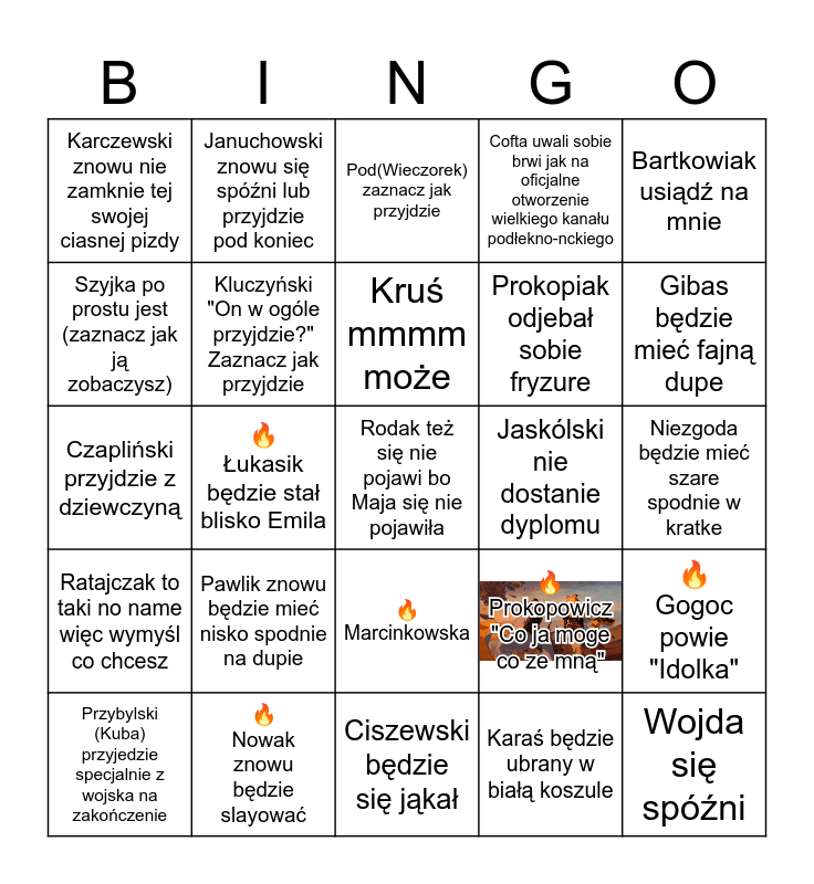 This bingo card has 1 images, a free space and 24 words: Pawlik znowu będzie mieć nisko spodnie na dupie, 🔥 Nowak znowu będzie slayować, Kruś mmmm może, Przybylski (Kuba) przyjedzie specjalnie z wojska na zakończenie, Bartkowiak usiądź na mnie, Karczewski znowu nie zamknie tej swojej ciasnej pizdy, Szyjka po prostu jest (zaznacz jak ją zobaczysz), Januchowski znowu się spóźni lub przyjdzie pod koniec, Jaskólski nie dostanie dyplomu, 🔥 Marcinkowska, Prokopiak odjebał sobie fryzure, Czapliński przyjdzie z dziewczyną, 🔥 Prokopowicz "Co ja moge co ze mną", 🔥 Gogoc powie "Idolka", Kluczyński "On w ogóle przyjdzie?" Zaznacz jak przyjdzie, Karaś będzie ubrany w białą koszule, Niezgoda będzie mieć szare spodnie w kratke, Pod(Wieczorek) zaznacz jak przyjdzie, Gibas będzie mieć fajną dupe, 🔥 Łukasik będzie stał blisko Emila, Wojda się spóźni, Ratajczak to taki no name więc wymyśl co chcesz, Cofta uwali sobie brwi jak na oficjalne otworzenie wielkiego kanału podłekno-nckiego and Ciszewski będzie się jąkał.