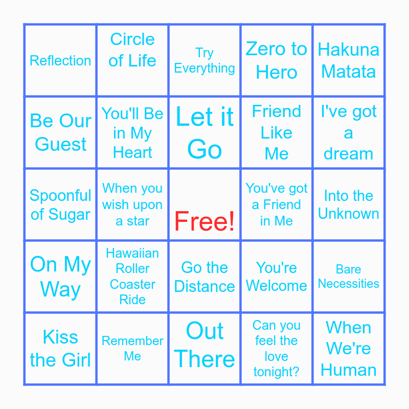 This bingo card has a free space and 24 words: Hawaiian Roller Coaster Ride, Remember Me, Let it Go, Kiss the Girl, Hakuna Matata, Reflection, Be Our Guest, Circle of Life, You've got a Friend in Me, Go the Distance, Friend Like Me, Spoonful of Sugar, You're Welcome, Bare Necessities, You'll Be in My Heart, Can you feel the love tonight?, Into the Unknown, Try Everything, I've got a dream, When you wish upon a star, When We're Human, On My Way, Zero to Hero and Out There.