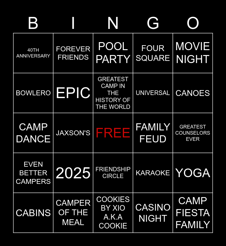 This bingo card has a free space and 24 words: 2025, CAMPER OF THE MEAL, GREATEST CAMP IN THE HISTORY OF THE WORLD, CABINS, MOVIE NIGHT, 40TH ANNIVERSARY, BOWLERO, FOREVER FRIENDS, FAMILY FEUD, FRIENDSHIP CIRCLE, UNIVERSAL, CAMP DANCE, KARAOKE, YOGA, EPIC, CASINO NIGHT, GREATEST COUNSELORS EVER, POOL PARTY, CANOES, JAXSON'S, CAMP FIESTA FAMILY, EVEN BETTER CAMPERS, FOUR SQUARE and COOKIES BY XIO A.K.A COOKIE.