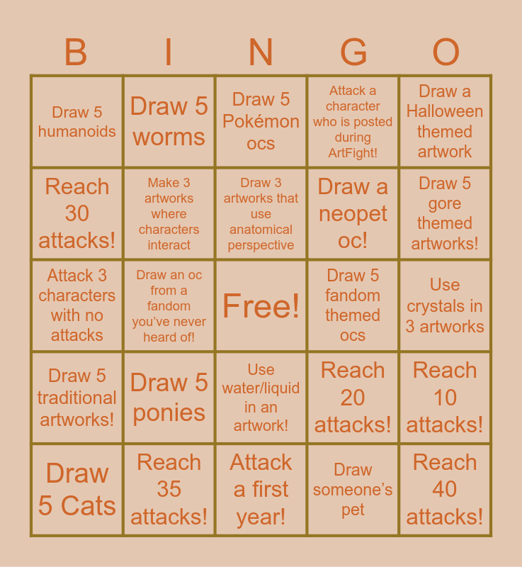 This bingo card has a free space and 24 words: Draw 5 Cats, Draw 5 ponies, Draw 3 artworks that use anatomical perspective, Draw someone’s pet, Draw a Halloween themed artwork, Draw 5 humanoids, Draw 5 worms, Draw 5 Pokémon ocs, Draw 5 fandom themed ocs, Use crystals in 3 artworks, Attack 3 characters with no attacks, Make 3 artworks where characters interact, Reach 20 attacks!, Reach 10 attacks!, Reach 30 attacks!, Reach 35 attacks!, Attack a first year!, Attack a character who is posted during ArtFight!, Draw 5 gore themed artworks!, Draw 5 traditional artworks!, Draw an oc from a fandom you’ve never heard of!, Use water/liquid in an artwork!, Draw a neopet oc! and Reach 40 attacks!.