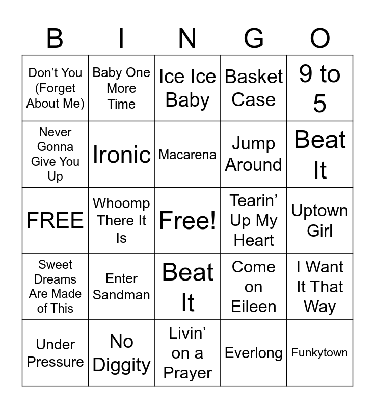 This bingo card has a free space and 54 words: Don’t Stop Believin’, Sweet Dreams Are Made of This, Running Up That Hill, I Wanna Dance With Somebody, Beat It, Conga, Basket Case, Should I Stay or Should I Go, Never Gonna Give You Up, Africa, Don’t You (Forget About Me), Girls Just Want to Have Fun, No Diggity, Under Pressure, Rhythm of the Night, Livin’ on a Prayer, Funkytown, Jump Around, Eye of the Tiger, Uptown Girl, Come on Eileen, Hey Mickey, Tearin’ Up My Heart, 9 to 5, Wake Me Up Before You Go-Go, Baby One More Time, U Can’t Touch This, All Star, Material Girl, Everlong, Wonderwall, Buddy Holly, The Fresh Prince of Bel-Air, Zombie, Ice Ice Baby, No Scrubs, FREE, I Want It That Way, I’m Gonna Be (500 Miles), Ironic, OPP, Gangsta’s Paradise, Say My Name, Barbie Girl, Enter Sandman, Walking On Sunshine, What is Love, Smells Like Teen Spirit, Macarena, Whoomp There It Is, Beat It, Sweet Dreams Are Made of This, Uptown Girl and 9 to 5.