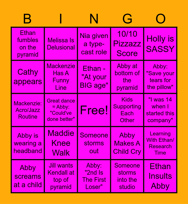 This bingo card has a free space and 49 words: Ethan Imitates Abby, Ethan Insults Abby, Ethan Disagrees With Abby's Pyramid, Abby: "2nd Is The First Loser", Maddie Knee Walk, Christi Kicks Off, Melissa Is Delusional, Ethan has a mini-breakdown, Cathy appears, Jill: "mY lItTLe kENdaLL", Mackenzie Has A Funny Line, 10/10 Pizzazz Score, Learning With Ethan/ Research Time, Abby Makes A Child Cry, Abby: "Only As Good As Your Last Dance", "Everyone's Replaceable", Ethan - "At your BIG age", Kids Supporting Each Other, Ethan Imitates Jill, Holly is SASSY, Great dance = Abby: "Could've done better", Someone storms into the studio, Ethan fumbles on the pyramid, Abby at bottom of the pyramid, Group dance is very questionable, Abby: "Save your tears for the pillow", Abby screams at a child, Abby goes 0-100 in one second FLAT, Someone storms out, Abby is wearing a headband, Ethan Forgot To Record, Christi complaining AGAIN!, Ethan applauds a dance, Abby is a hypocrite, Jill wants Kendall at top of pyramid, Abby holds info back from moms, Abby kicks someone out of practice, Ethan: "Rough and Tough", "I was 14 when I started this company", YUGEEEE, Abby gets ripped of the pyramid, Production Interference, Kelly/The Kids Get Mentioned, Maddie: lyrical or contemporary solo, Mackenzie: Acro/Jazz Routine, Nia given a type-cast role, Kendall: Fast Jazz Routine, HONESTLY!!! and What are we doing/what's happening?!.