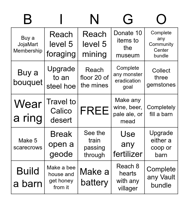 This bingo card has a free space and 102 words: Beat a level of Prairie King, Buy the first backpack upgrade, Complete any Community Center bundle, Reach floor 40 of the mines, Reach 4 hearts with any villager, Make 5,000 gold in one night, Pass out, Give a hated gift to an eligible marriage candidate, Give a loved gift to an eligible marriage candidate, Give a hated gift to any non-eligible marriage candidate, Give a loved gift to any non-eligible marriage candidate, Make 20,000 gold total, Get a diamond, Give a hated gift to any villager, Give a loved gift to any villager, Make 5 furnaces, Make 5 scarecrows, Make 5 sprinklers (of any quality), Harvest a giant crop, Get a prismatic shard, Cook any recipie, Have max daily luck, Have worst daily luck, Buy something from Joja, Smelt 1 copper, iron, and gold bars, Collect three gemstones, Donate 10 items to the museum, Break open a geode, Catch a gold quality fish, Reach level 5 farming, Reach level 5 foraging, Reach level 5 mining, Reach level 5 fishing, Reach level 5 combat, Sell trash, See the train passing through, Relax in the spa, Meet every villager, Wear a ring, Reach 8 hearts with any villager, Plant and harvest from a fruit tree, Build a coop, Build a barn, Unlock the secret beach, Unlock the secret woods, Attend any festival, Reach year 2, Complete any monster eradication goal, Buy something from the travelling cart, Upgrade your house, Fill the farm cave (fruits or mushrooms), Buy a mermaid pendant, Buy a bouquet, Fully complete any one room in the Community Center, Complete any Crafts Room bundle, Complete any Pantry bundle, Complete any Fish Tank bundle, Complete any Boiler Room bundle, Complete any Bulletin Board bundle, Complete any Vault bundle, Harvest any gold quality crop, Forage any gold quality forageable, Harvest all crops for a single season, Harvest one crop from each season, Buy any wallpaper or flooring for your house, Get maple syrup, oak resin, and pine tar, Completely fill a coop, Completely fill a barn, Travel to Calico desert, Make a bee house and get honey from it, Adopt a cat or dog, Get a stardrop, Wear a hat, Ride a horse, Get a level 5 or higher weapon, Fish up a treasure chest, Upgrade to an steel hoe, Upgrade to an steel axe, Upgrade to a steel pickaxe, Upgrade to a steel watering can, Wear boots, Wear a different shirt, Give a bouquet, Make any wine, beer, pale ale, or mead, Make any cheese, Reach floor 20 of the mines, Make any pickled item or jelly, Make any mayonnaise, Reach floor 60 of the mines, Reach floor 80 of the mines, Use a bomb in the mines, Use any fertilizer, Clear an infested floor in the mines, Make and use a staircase, Eat any food, Make a battery, Buy a JojaMart Membership, Buy any furniture from Robin, Upgrade either a coop or barn, Build a shed, Build a well and Build a second shipping bin.