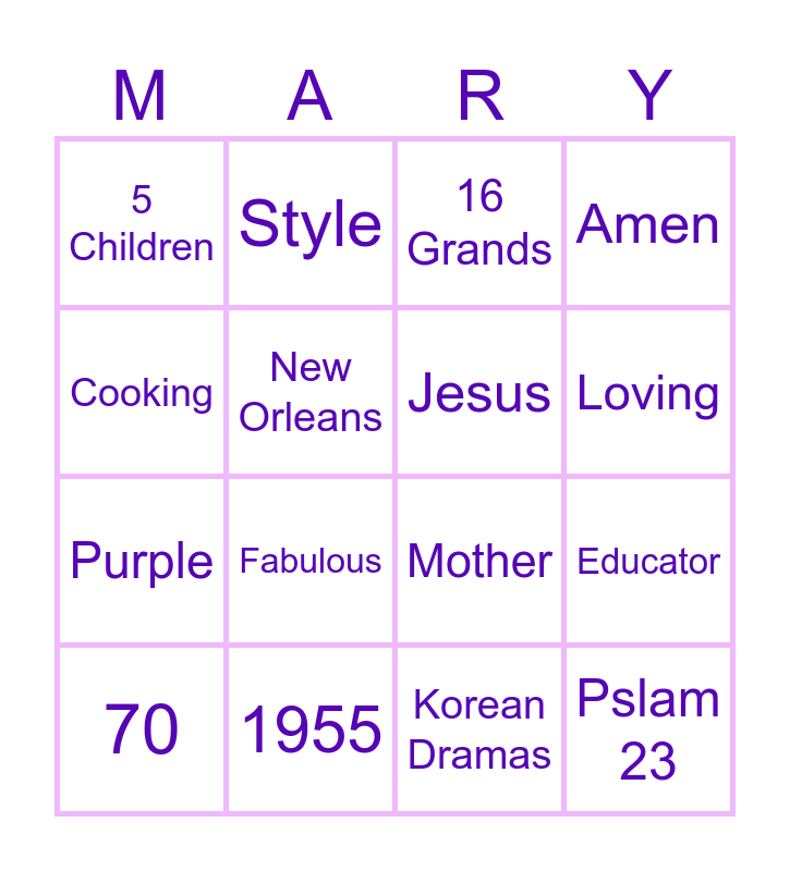 This bingo card has 22 words: 1955, July 21st, Style, Momo, New Orleans, Jesus, 5 Children, 16 Grands, Mother, Pslam 23, Purple, Amen, Painting, Bible Study, Korean Dramas, Faith, Educator, 70, Fabulous, Cooking, Loving and Energetic.