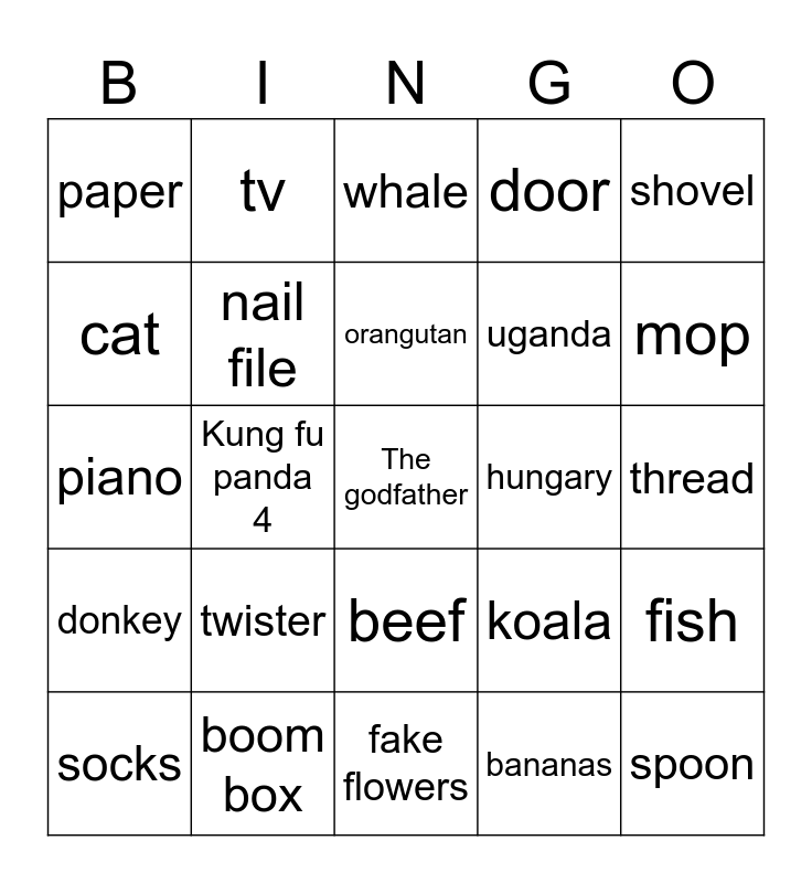 This bingo card has a free space and 24 words: twister, boom box, orangutan, socks, shovel, paper, cat, tv, hungary, beef, uganda, piano, koala, fish, nail file, bananas, thread, whale, mop, Kung fu panda 4, spoon, donkey, door and fake flowers.