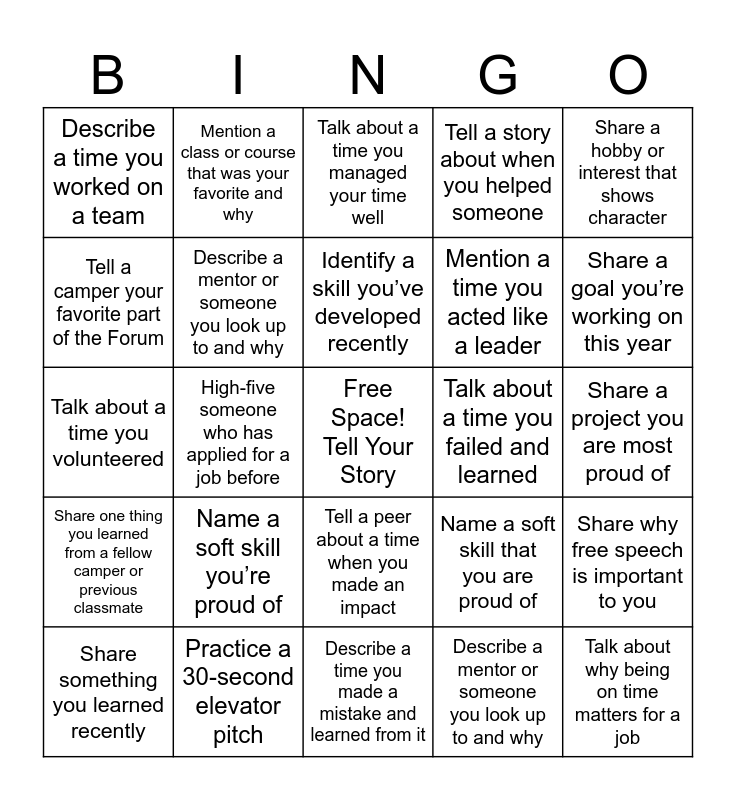 This bingo card has a free space and 24 words: Name a soft skill you’re proud of, Practice a 30-second elevator pitch, Identify a skill you’ve developed recently, Share something you learned recently, Share a hobby or interest that shows character, Describe a time you worked on a team, Tell a camper your favorite part of the Forum, Mention a class or course that was your favorite and why, Talk about a time you failed and learned, Tell a peer about a time when you made an impact, Mention a time you acted like a leader, Talk about a time you volunteered, Name a soft skill that you are proud of, Share why free speech is important to you, Describe a mentor or someone you look up to and why, Describe a mentor or someone you look up to and why, Share a project you are most proud of, Talk about a time you managed your time well, Share a goal you’re working on this year, High-five someone who has applied for a job before, Talk about why being on time matters for a job, Share one thing you learned from a fellow camper or previous classmate, Tell a story about when you helped someone and Describe a time you made a mistake and learned from it.