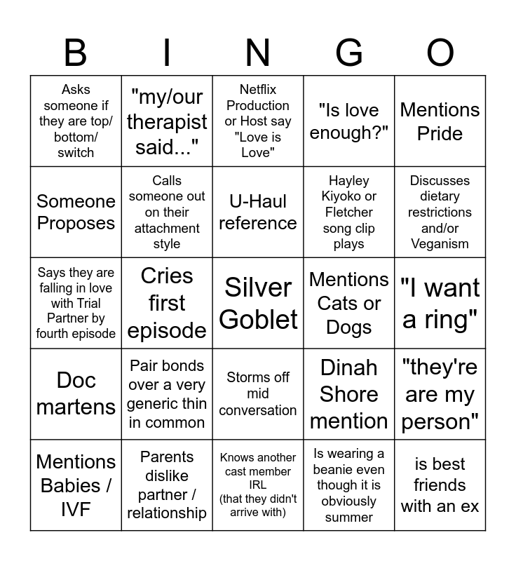 This bingo card has a free space and 29 words: Blames something on Astrological Sign, Parents dislike partner / relationship, Netflix Production or Host say "Love is Love", Sad backstory reveal, Mentions Pride, Asks someone if they are top/ bottom/ switch, Calls someone out on their attachment style, U-Haul reference, Mentions Cats or Dogs, "they're are my person", Mentions Babies / IVF, Cries first episode, Is wearing a beanie even though it is obviously summer, is best friends with an ex, Says they are falling in love with Trial Partner by fourth episode, One partner wants to do ENM, Knows another cast member IRL (that they didn't arrive with), Dinah Shore mention, Discusses dietary restrictions and/or Veganism, Doc martens, Pair bonds over a very generic thin in common, Host calls it a "social experiment", Hayley Kiyoko or Fletcher song clip plays, "I want a ring", Someone Proposes, "my/our therapist said...", Storms off mid conversation, "Is love enough?" and shares coming out story.
