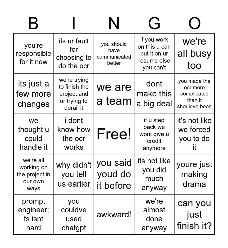 This bingo card has a free space and 24 words: why didn't you tell us earlier, you couldve used chatgpt, we are a team, prompt engineer; ts isnt hard, we're all busy too, you're responsible for it now, its just a few more changes, its ur fault for choosing to do the ocr, if u step back we wont give u credit anymore, you said youd do it before, dont make this a big deal, we thought u could handle it, its not like you did much anyway, youre just making drama, we're trying to finish the project and ur trying to derail it, we're almost done anyway, it's not like we forced you to do it, you should have communicated better, you made the ocr more complicated than it shouldve been, i dont know how the ocr works, can you just finish it?, we're all working on the project in our own ways, if you work on this u can put it on ur resume else you can't and awkward!.