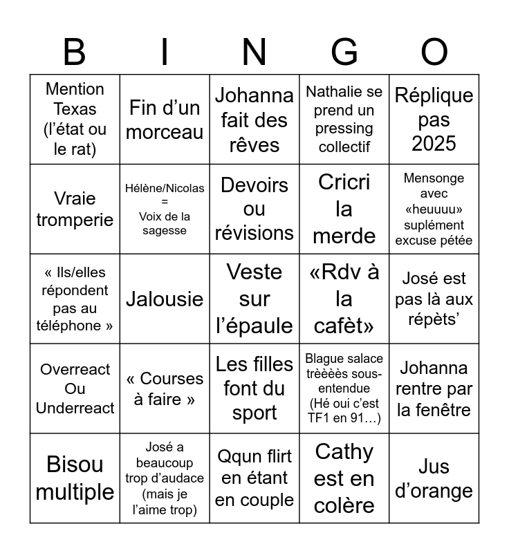 This bingo card has 25 words: « Courses à faire », Qqun flirt en étant en couple, Devoirs ou révisions, Bisou multiple, Réplique pas 2025, Mention Texas (l’état ou le rat), Vraie tromperie, Fin d’un morceau, «Rdv à la cafèt», Les filles font du sport, Cricri la merde, « Ils/elles répondent pas au téléphone », Blague salace trèèèès sous-entendue (Hé oui c’est TF1 en 91…), Johanna rentre par la fenêtre, Hélène/Nicolas = Voix de la sagesse, Jus d’orange, José est pas là aux répèts’, Johanna fait des rêves, Mensonge avec «heuuuu» suplément excuse pétée, Jalousie, Veste sur l’épaule, José a beaucoup trop d’audace (mais je l’aime trop), Overreact Ou Underreact, Nathalie se prend un pressing collectif and Cathy est en colère.