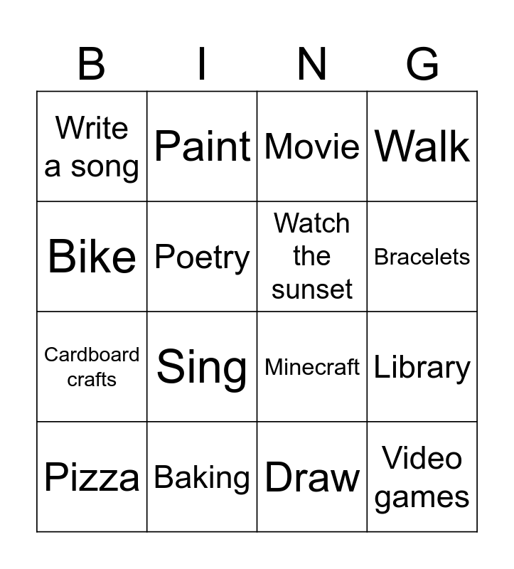 This bingo card has 16 words: Pizza, Baking, Movie, Walk, Bike, Paint, Minecraft, Library, Write a song, Poetry, Draw, Bracelets, Cardboard crafts, Sing, Watch the sunset and Video games.