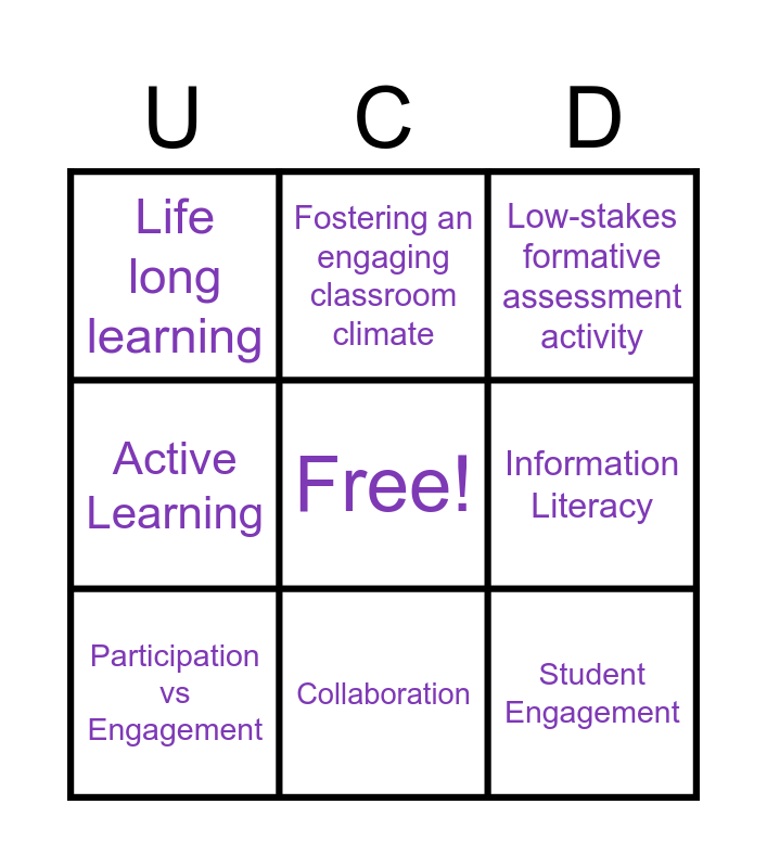 This bingo card has a free space and 8 words: Information Literacy, Low-stakes formative assessment activity, Fostering an engaging classroom climate, Participation vs Engagement, Life long learning, Student Engagement, Active Learning and Collaboration.