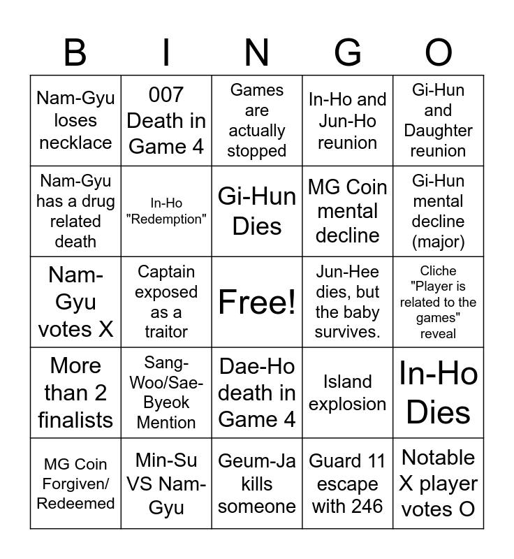 This bingo card has a free space and 24 words: Sang-Woo/Sae-Byeok Mention, Min-Su VS Nam-Gyu, Gi-Hun Dies, MG Coin Forgiven/ Redeemed, Gi-Hun and Daughter reunion, Nam-Gyu loses necklace, Nam-Gyu has a drug related death, 007 Death in Game 4, Jun-Hee dies, but the baby survives., Dae-Ho death in Game 4, MG Coin mental decline, Nam-Gyu votes X, Island explosion, In-Ho Dies, In-Ho "Redemption", Guard 11 escape with 246, Cliche "Player is related to the games" reveal, Games are actually stopped, Gi-Hun mental decline (major), Captain exposed as a traitor, Notable X player votes O, More than 2 finalists, In-Ho and Jun-Ho reunion and Geum-Ja kills someone.