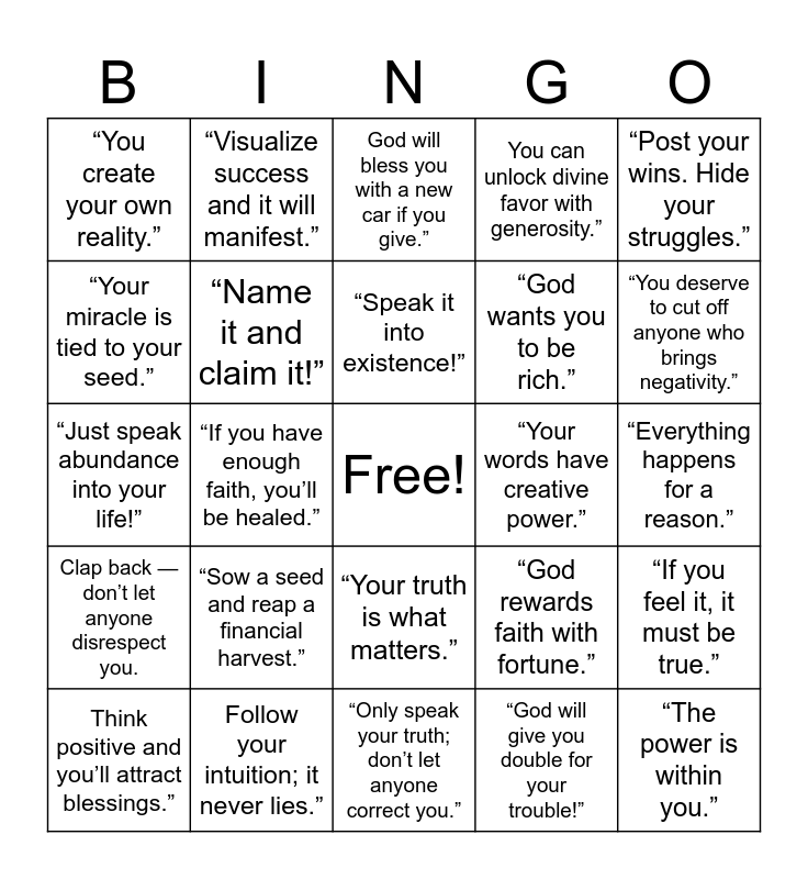 This bingo card has a free space and 24 words: “Sow a seed and reap a financial harvest.”, Follow your intuition; it never lies.”, “Speak it into existence!”, Think positive and you’ll attract blessings.”, “Post your wins. Hide your struggles.”, “You create your own reality.”, “Your miracle is tied to your seed.”, “Visualize success and it will manifest.”, “Your words have creative power.”, “Your truth is what matters.”, “God wants you to be rich.”, “Just speak abundance into your life!”, “God rewards faith with fortune.”, “If you feel it, it must be true.”, “Name it and claim it!”, “God will give you double for your trouble!”, “Everything happens for a reason.”, God will bless you with a new car if you give.”, “You deserve to cut off anyone who brings negativity.”, “If you have enough faith, you’ll be healed.”, “The power is within you.”, Clap back — don’t let anyone disrespect you., You can unlock divine favor with generosity.” and “Only speak your truth; don’t let anyone correct you.”.